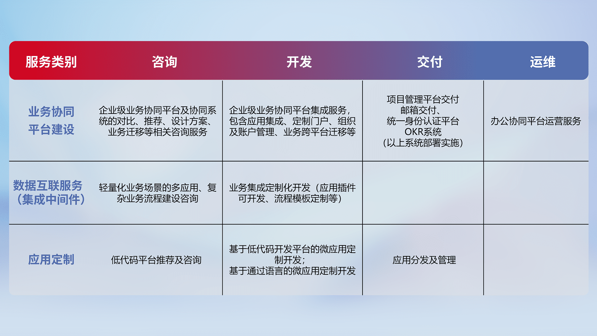 针对钉钉、、企微、、、IDaas等平台级产品提供产品的规划、、、、方案、、、、交付、、、、定制化开发等服务,,,,实现如统一协同办公、、、、智能客户服务、、、混合会议管理、、、智能数据查询、、等业务场景,,,实现数字化转型。。。。